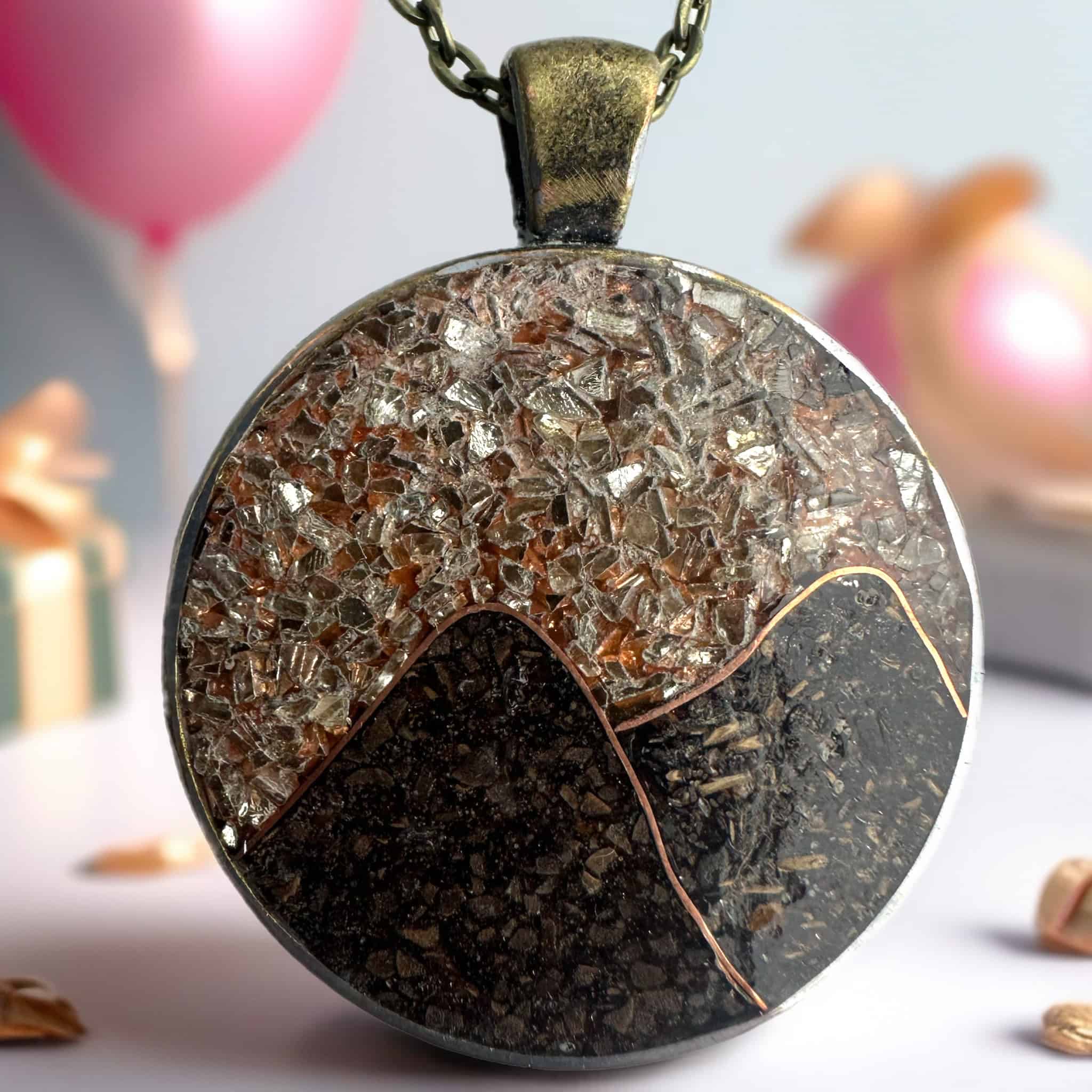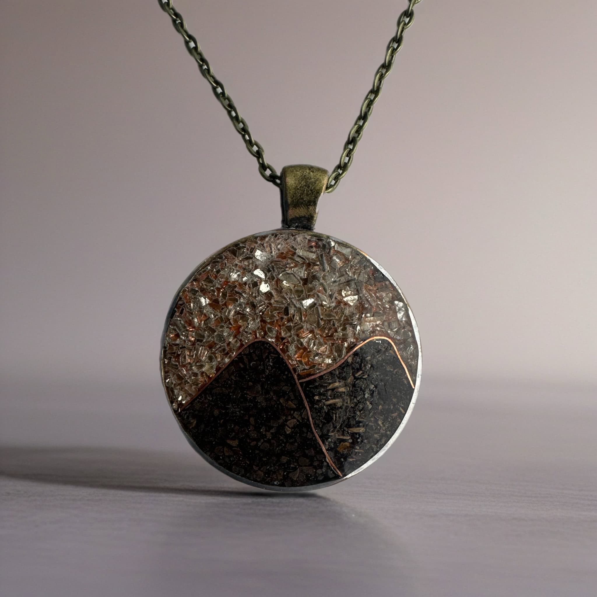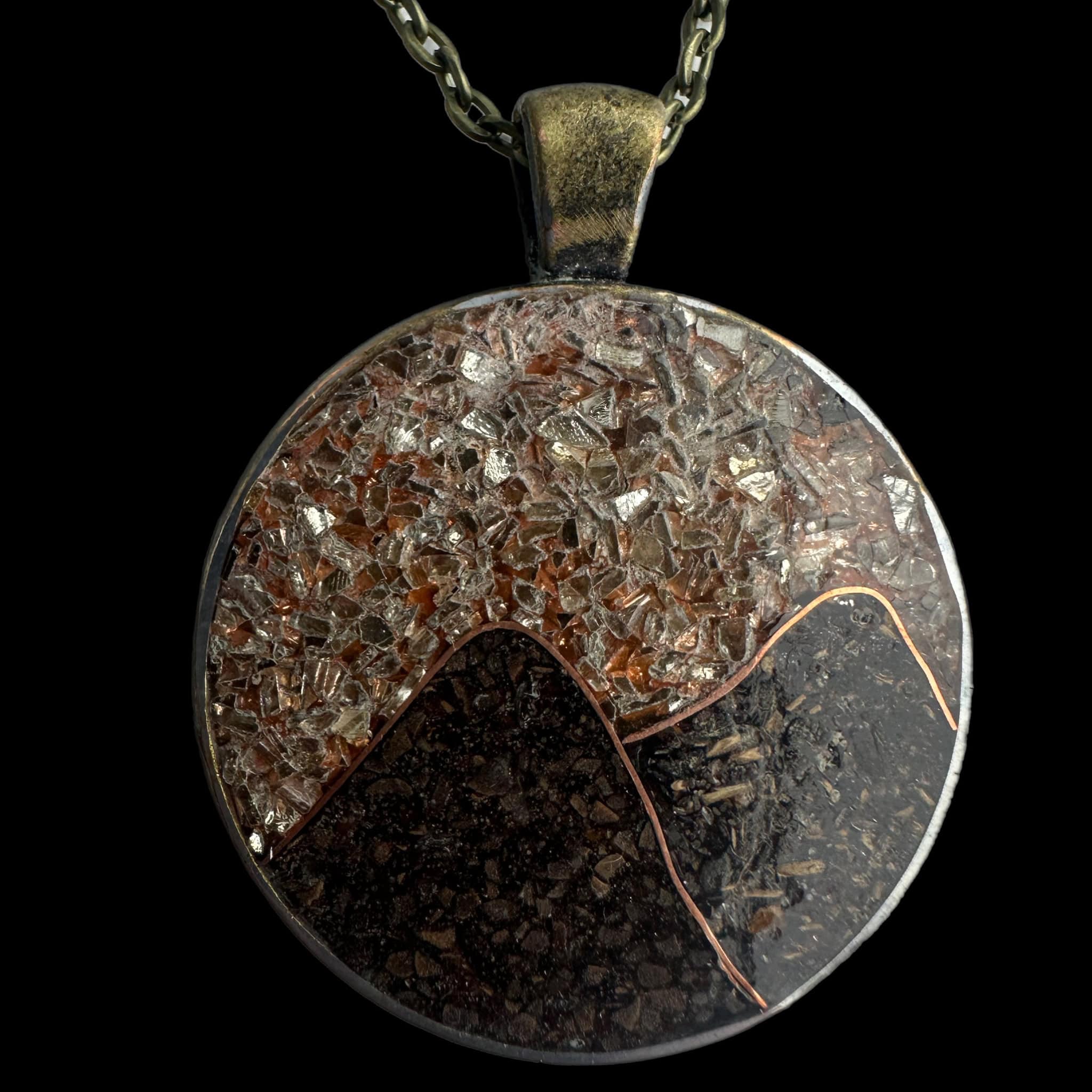 Handcrafted brass mountain pendant necklace featuring copper peaks and a rich coffee and chai tea filling and a glass sky. A bold statement piece inspired by rugged landscapes and quiet mornings or evenings in the mountains.