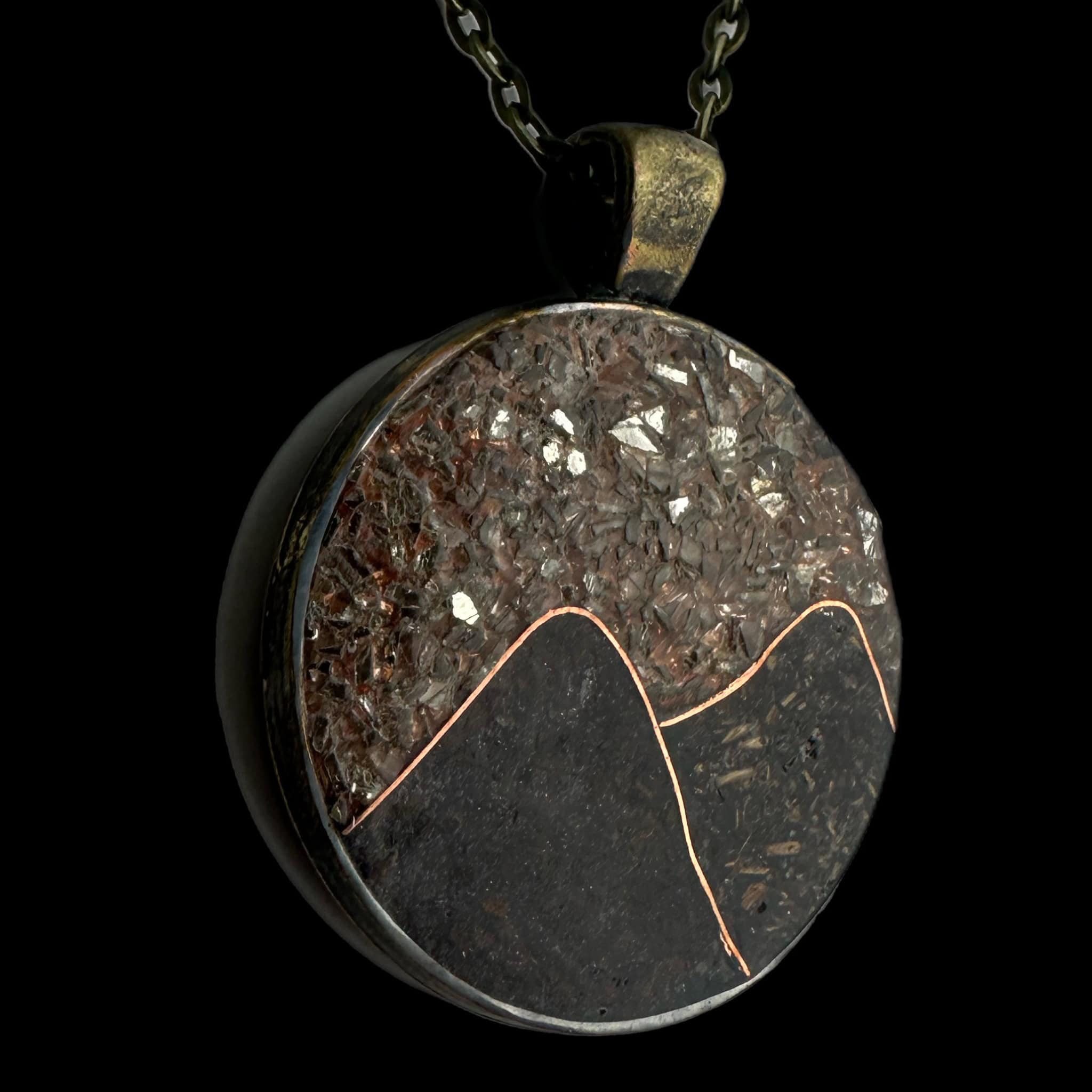 - Pendant Material: Solid brass with copper mountain inlay