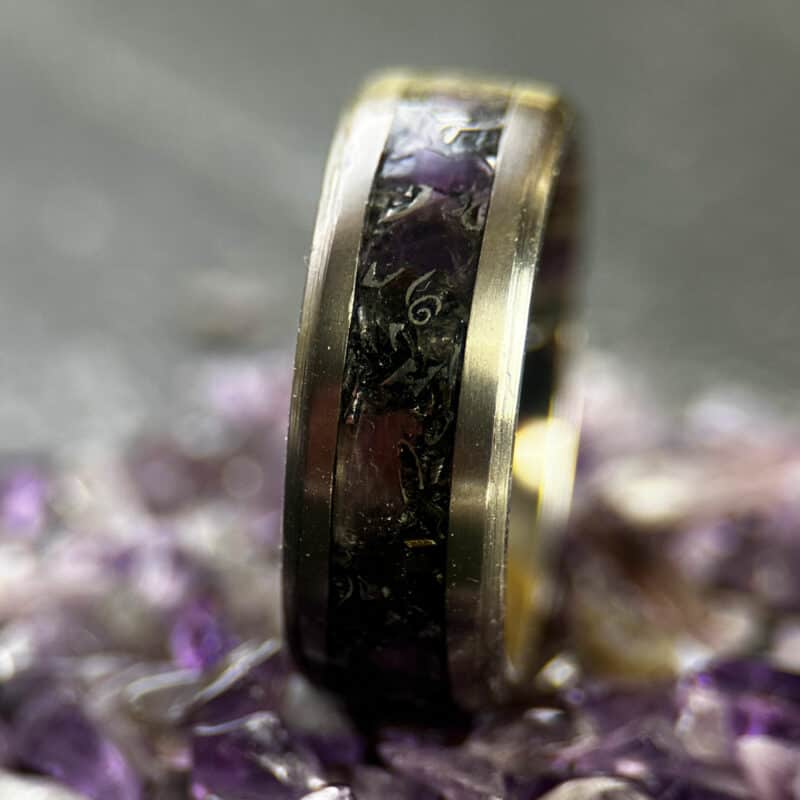 - Materials – Men’s ring with amethyst and scrap tank steel as an inlay to a tungsten ring core.