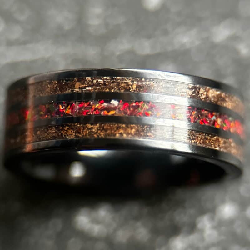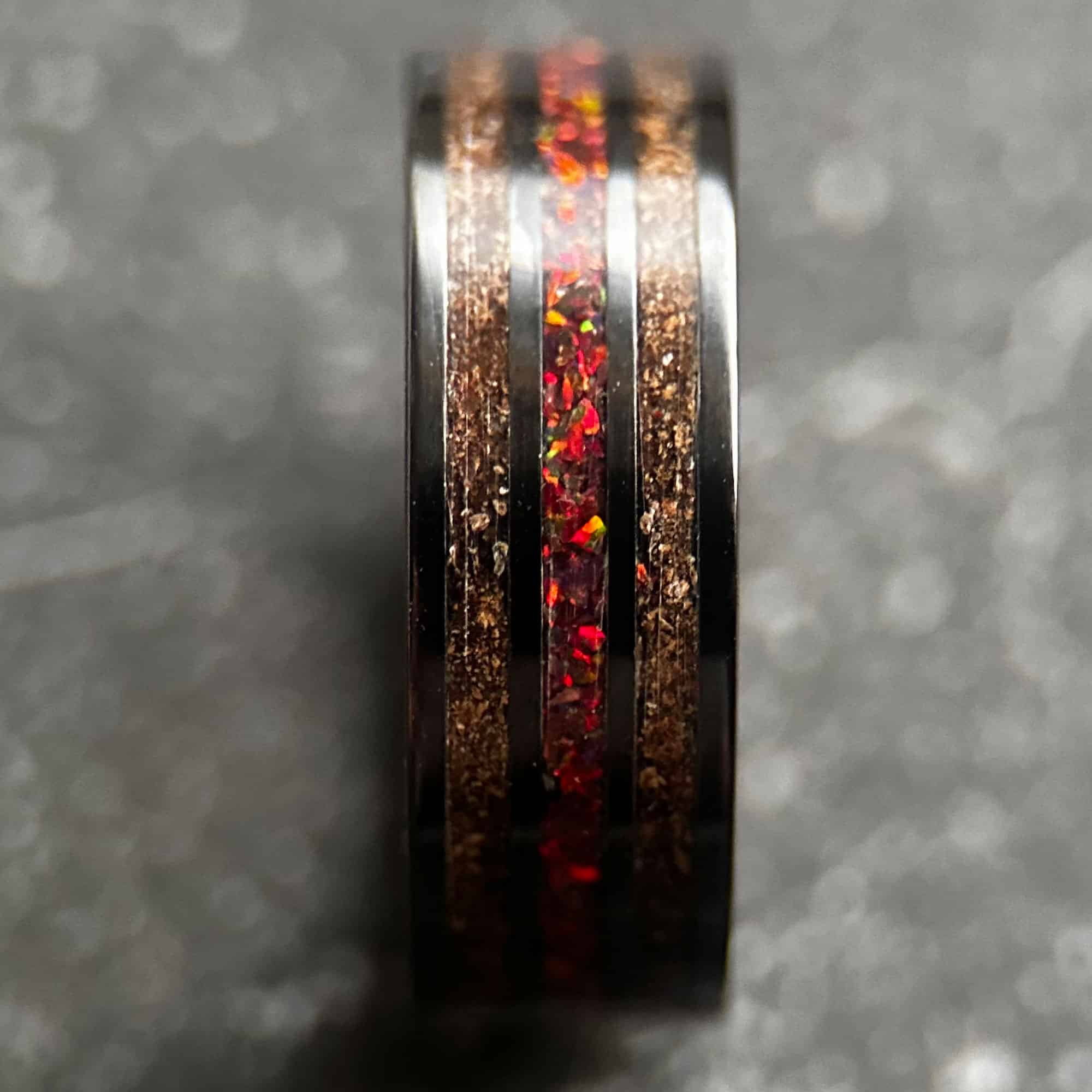 - Uses genuine dark t-rex fossil fragments in two channels and magma colored opal in the center.